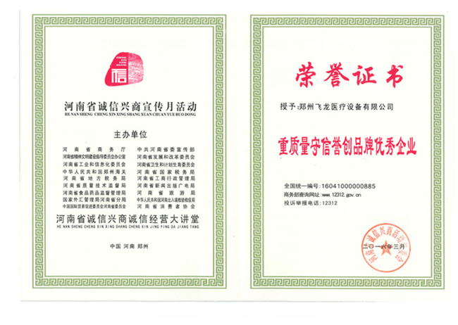 鄭州飛龍醫(yī)療設(shè)備有限公司獲得榮譽證書